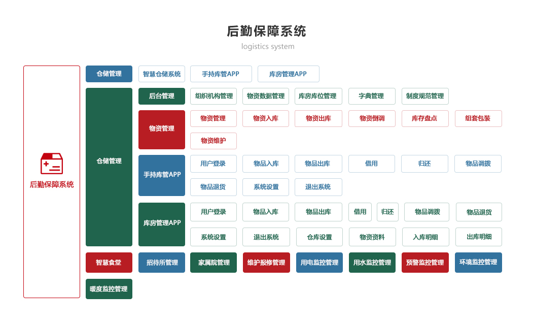 綜合保障系統(tǒng)依托物聯(lián)網(wǎng)、RFID識(shí)別和傳感技術(shù),著眼作戰(zhàn)精準(zhǔn)保障、戰(zhàn)備常態(tài)保障和官兵生活保障,對(duì)戰(zhàn)備物資、裝備器材、營房物資和被裝物資等的全生命周期的電子化管理,對(duì)官兵的健康實(shí)時(shí)監(jiān)護(hù)。包含財(cái)務(wù)管理、軍需油運(yùn)、武器裝備、衛(wèi)勤管理、營房管理模塊。確保部隊(duì)出動(dòng),車輛給養(yǎng)油料跟得上,裝備維護(hù)情況實(shí)時(shí)掌握,營房管理工作平時(shí)與戰(zhàn)備同步推進(jìn)。